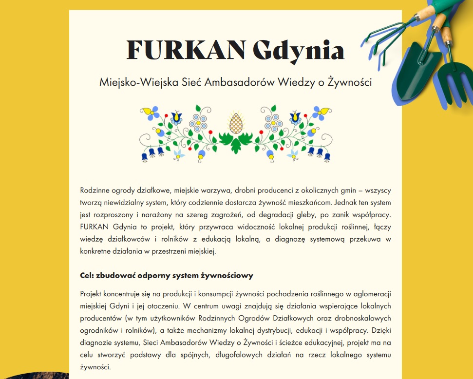 W dniu 25.07.2025 r. w Pomorskim Parku Naukowo-Technologicznym w Gdyni, w ramach projektu FURKAN Gdynia, prowadzonego przez firmę Busola Trends i Urząd Miasta Gdyni, we współpracy z Fundacją Zatoka odbyły się warsztaty poświęcone tworzeniu rozwiązań dla lokalnego systemu żywności. W spotkaniu tym, na zaproszenie organizatorów, uczestniczył Pan Grzegorz Drozdowski – skarbnik Zarządu ROD. Projekt jest częścią programu EIT Community New European Bauhaus Enhance 2025 "Wzmocnienie Nowego Europejskiego Bauhaus (tzw. „domu budowy”) w ramach Wspólnoty EIT 2025", finansowanego przez Europejski Instytut Innowacji i Technologii (EIT).