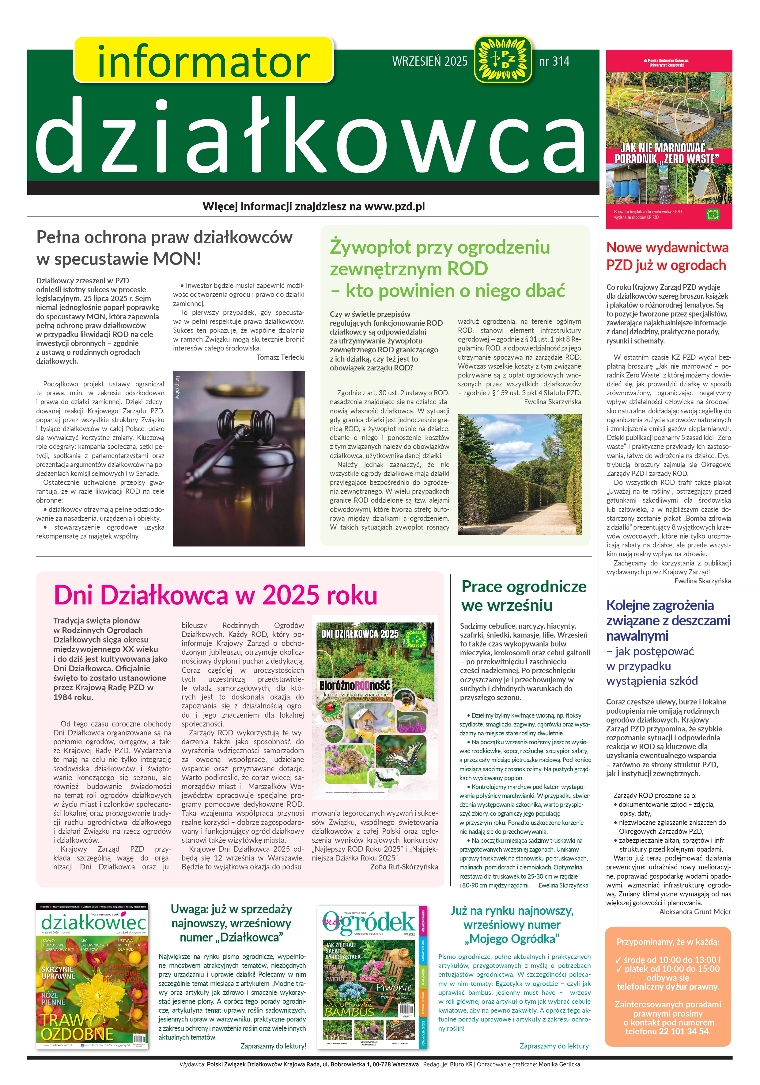 W najnowszym Informatorze „działkowca” m.in. o pełnej ochronie prawa działkowców w specustawie MON, Dniach Działkowca 2025, żywopłotach przy ogrodzeniu zewnętrznym ROD, pracach ogrodniczych we wrześniu, nowej broszurze „Jak nie marnować-poradnik zero waste”.