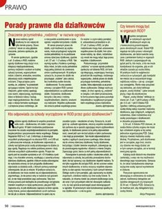 ● W rubryce „Porady prawne dla działkowców” podajemy wyjaśnienia najważniejszych i aktualnych kwestii prawnych związanych z użytkowaniem działki i członkostwem w Związku. W tym numerze przedstawiamy tematy: „Znaczenie przymiotnika »rodzinny« w nazwie ogrodu”, „Kto odpowiada za szkody wyrządzone w ROD przez gości działkowców?”, „Czy krewni mogą być w organach ROD?”.
