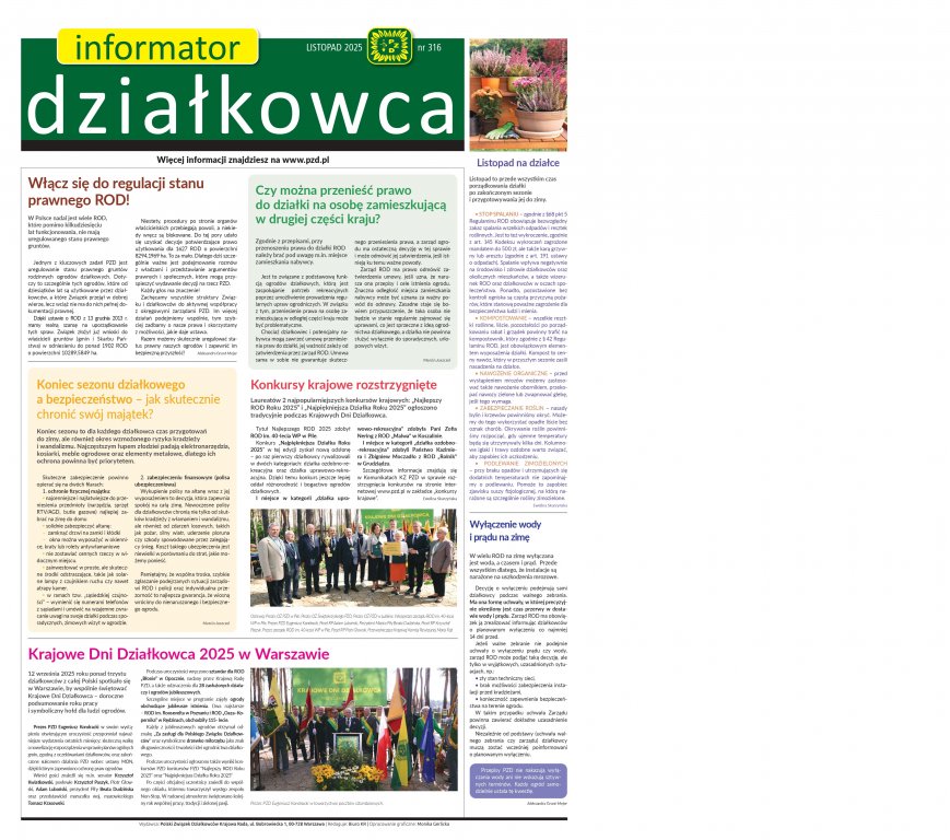 W najnowszym Informatorze „działkowca” m.in. o: Krajowych Dniach Działkowca 2025, rozstrzygnięciu konkursów krajowych, zabezpieczeniu działki na zimę, wyłączania prądu i wody na zimę, regulacji stanu prawnego gruntów ROD, możliwości nabycia działki przez osoby zamieszkujące w odległej części kraju oraz o zalecanych pracach ogrodniczych w listopadzie.