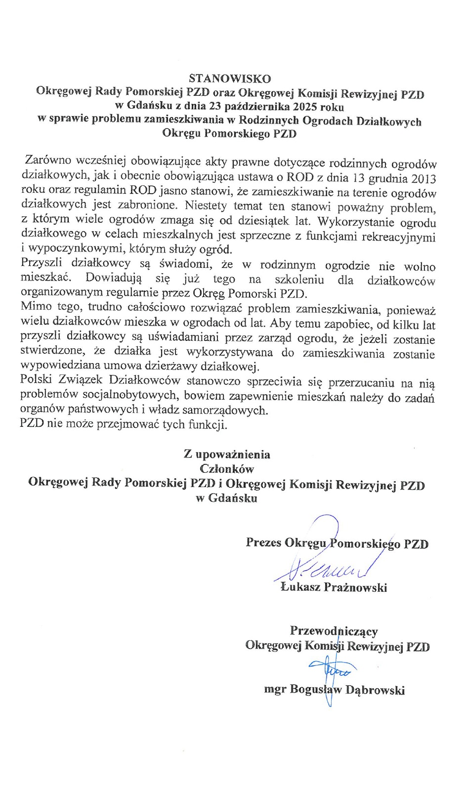 Stanowisko Okręgowej Rady Pomorskiej i Okręgowej Komisji Rewizyjnej PZD w Gdańsku z dnia 23.10.2025 r. ws. problemu zamieszkiwania w ROD Okręgu Pomorskiego PZD