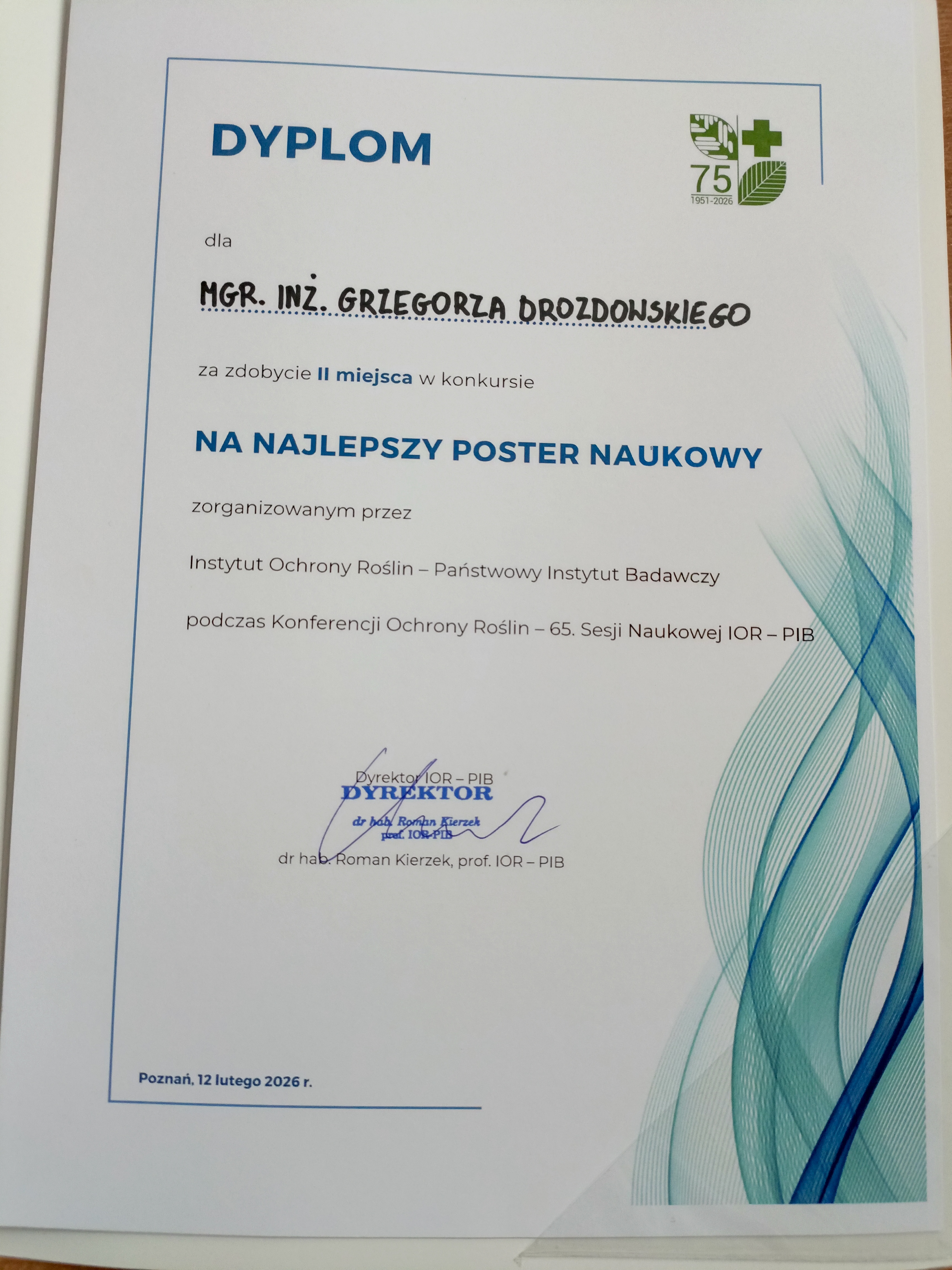 Przygotowana praca spotkała się z dużym uznaniem uczestników Konferencji Ochrony Roślin i zdobyła II miejsce w konkursie na Najlepszy Poster podczas 65. Sesji Naukowej.